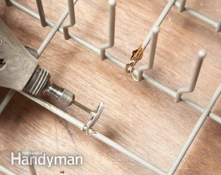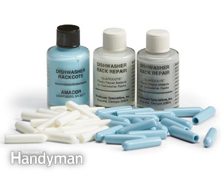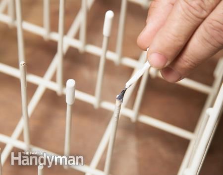 A rusty dishwasher rack can leave rust streaks on dishes. Instead of buying an overpriced replacement rack, recoat and cover the rusty spots yourself in less than an hour. Dishwasher rack tines break off or lose the protective coating at the tips and then you get rust spots on your dishes. New racks cost about $80 (and up). But you can fix yours in less than an hour and for a fraction of that cost. Buy a bottle of vinyl repair paint and a package of replacement tips to match your rack color (from any appliance parts store or find-a-fix.com). Cut off the rusted tips with a rotary tool and cutoff wheel. Then retip the tines (Photo 2). To patch a rusted area around a broken tine, first clean off the rust (Photo 1). |